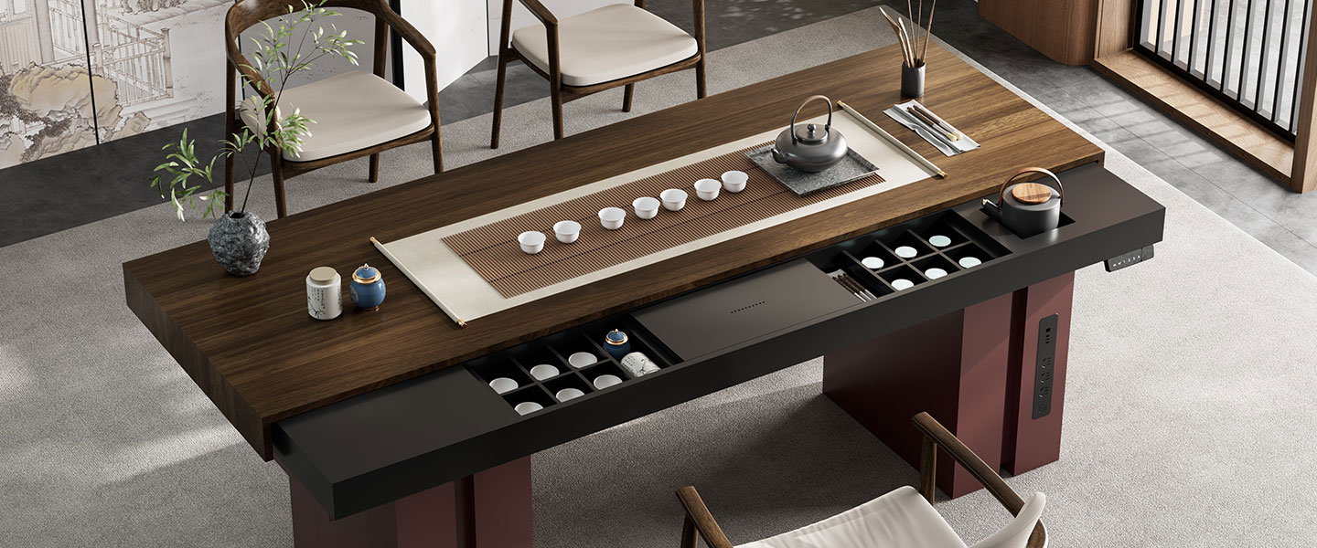 融合茶文化审美与现代电动升降技术,采用四电机结构,稳固承托整套茶具与茶水循环系统。 桌面高度一键调节,适配不同会客与品茶姿态,是商务接待与休闲交流的双重载体。
